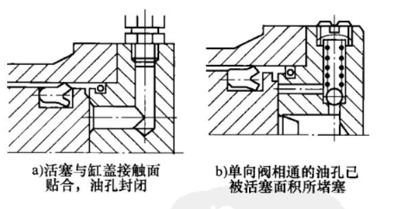 活塞桿斷面與缸蓋斷面緊貼后,造成封閉進(jìn)油通路,并使活塞承受壓力的面積不夠,圖2為帶緩沖裝置的液壓缸,缸蓋上單向閥油路被活塞擋住油孔,只在緩沖柱塞較小的端面上承受壓力油的作用,產(chǎn)生的力很小,不足以克服液壓缸的載荷,因而液壓缸不動(dòng)作。
